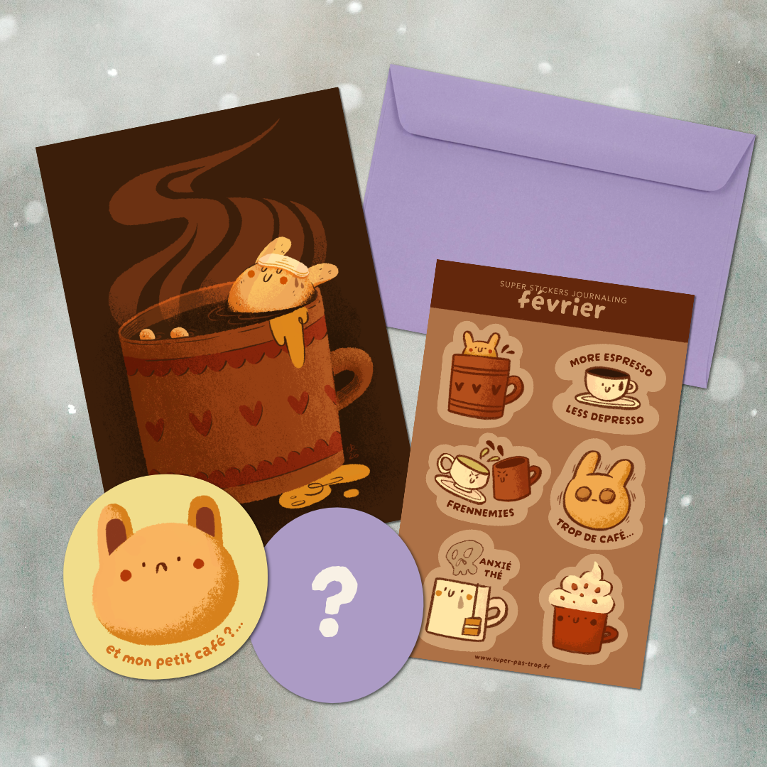 Le Super Club, c’est le courrier qui te réconcilie avec ta boîte aux lettres ! Chaque mois, tu reçois des stickers et illustrations réalisés rien que pour le club, dessinés et fabriqués artisanalement à Toulouse (par moi !), une jolie lettre pour prendre le temps de ralentir, et 10% de réduction permanente dans la boutique.